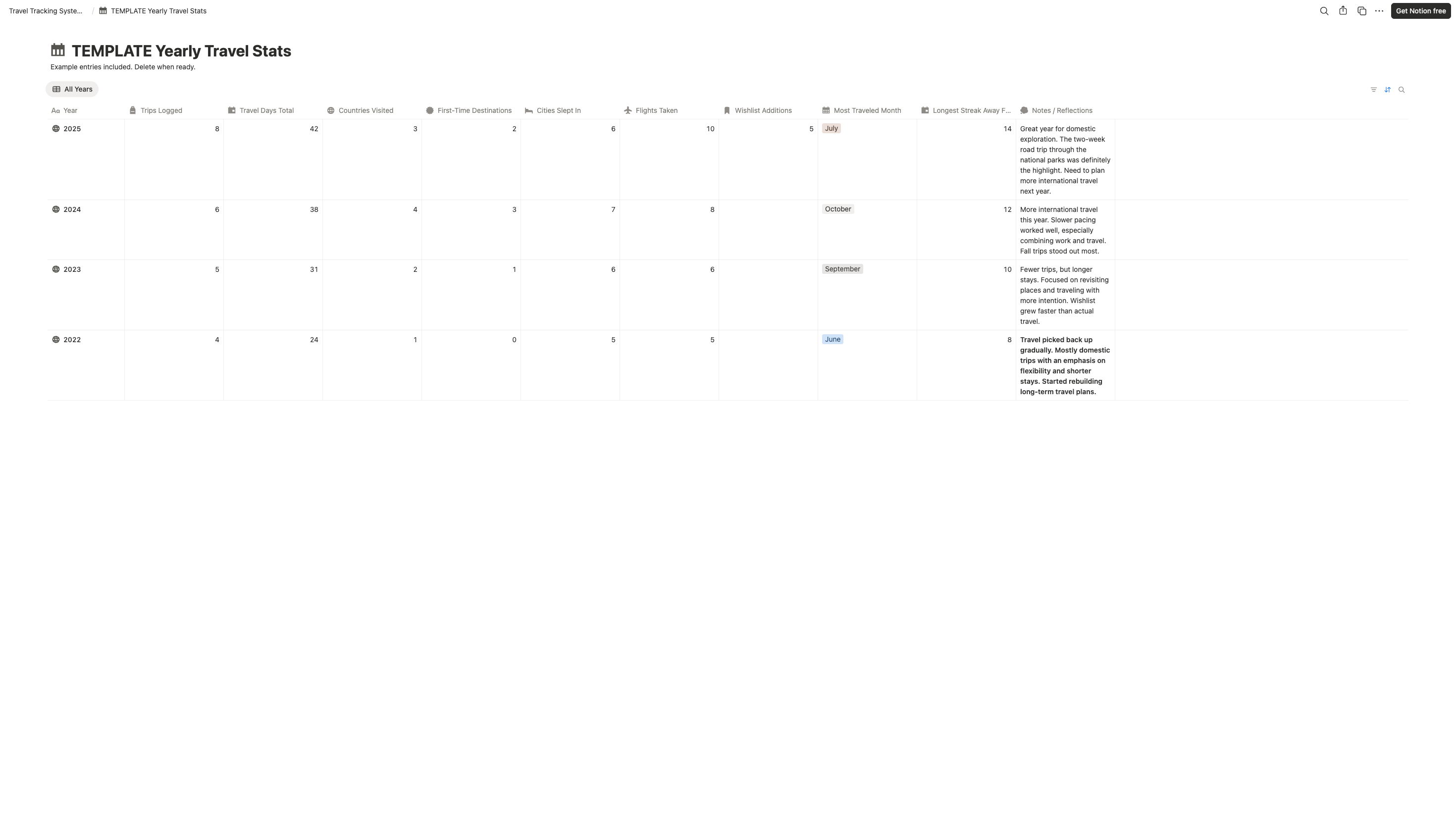 A simple, long-term system for recording past trips, planning future destinations, and tracking yearly travel stats in one place.