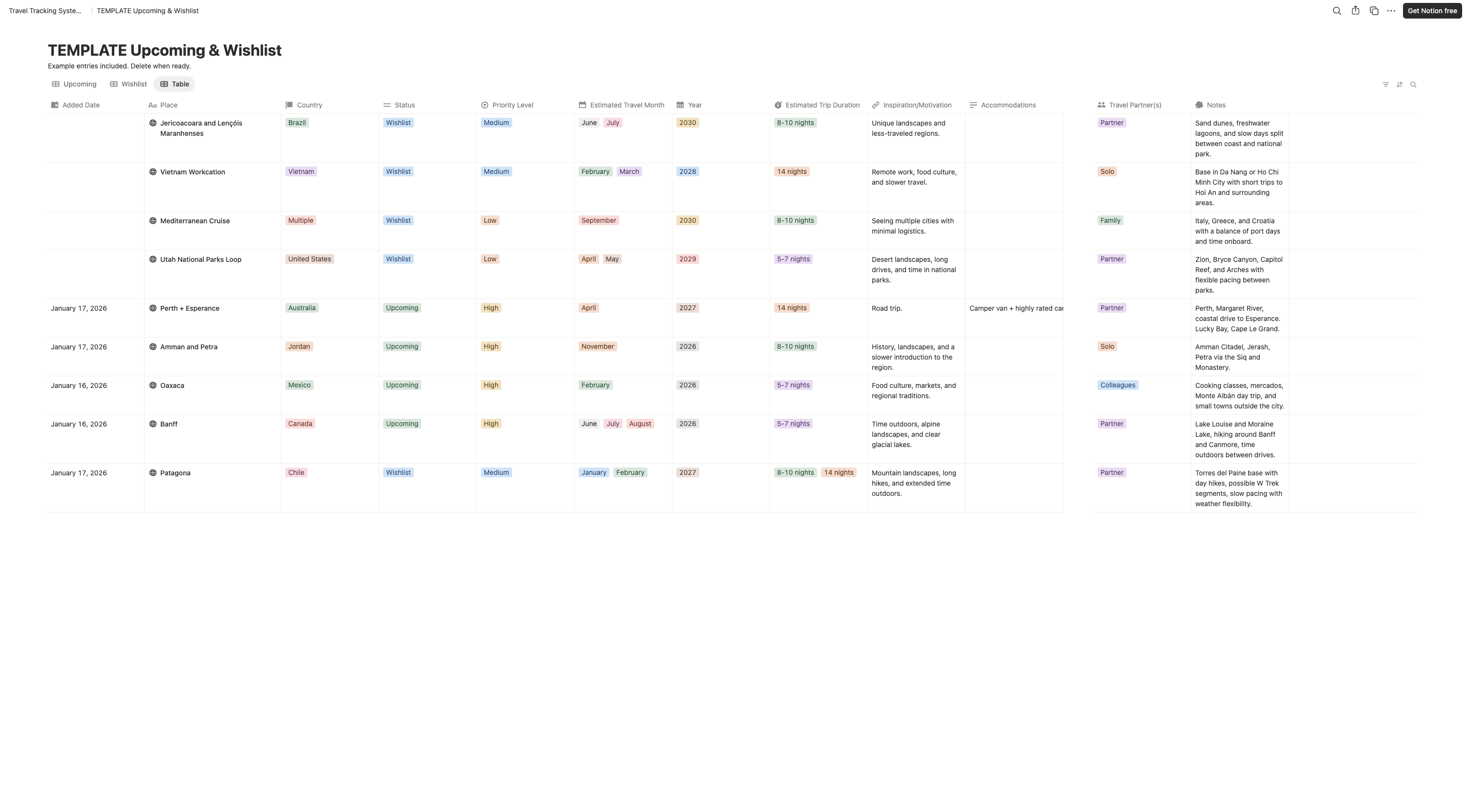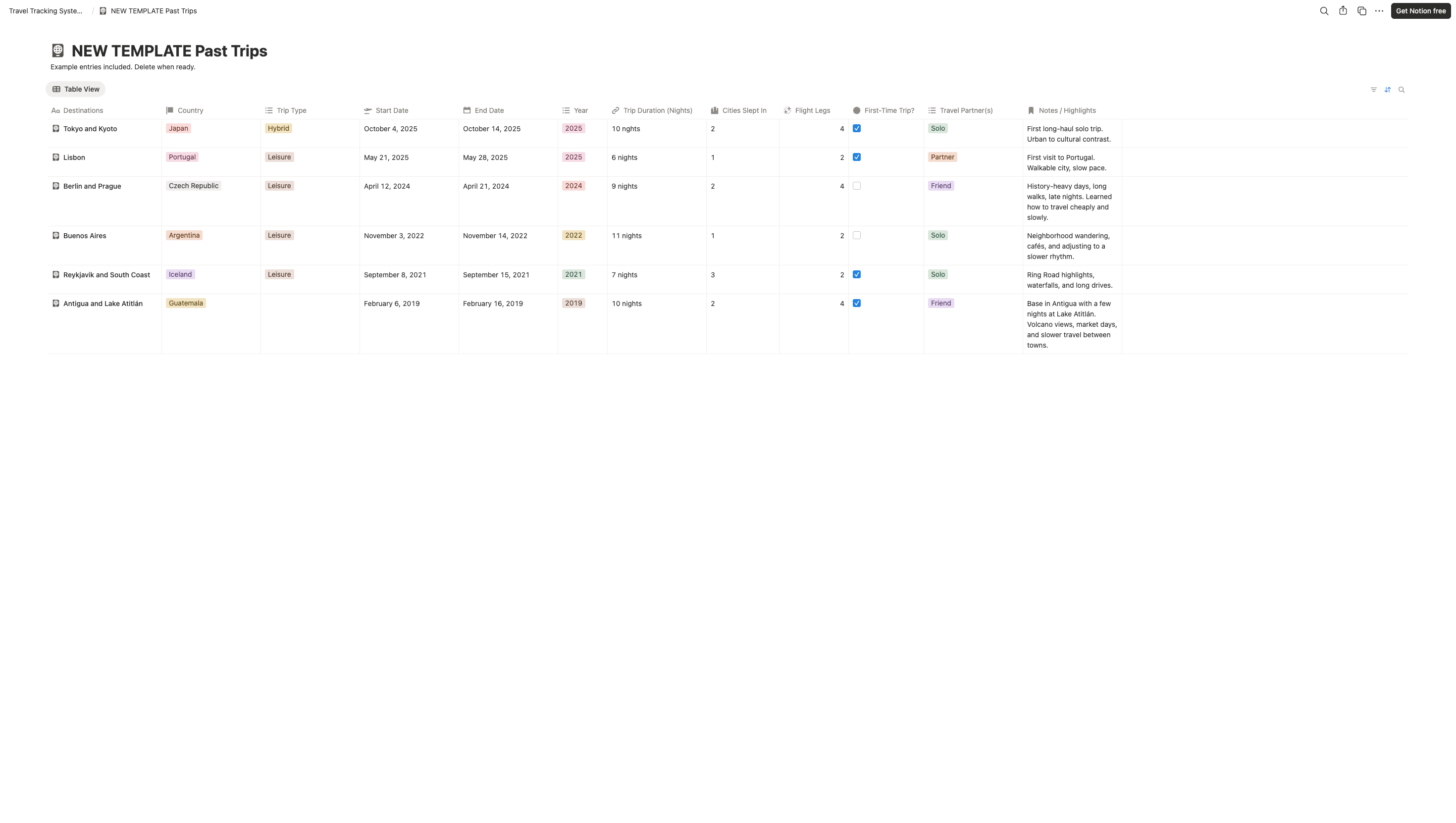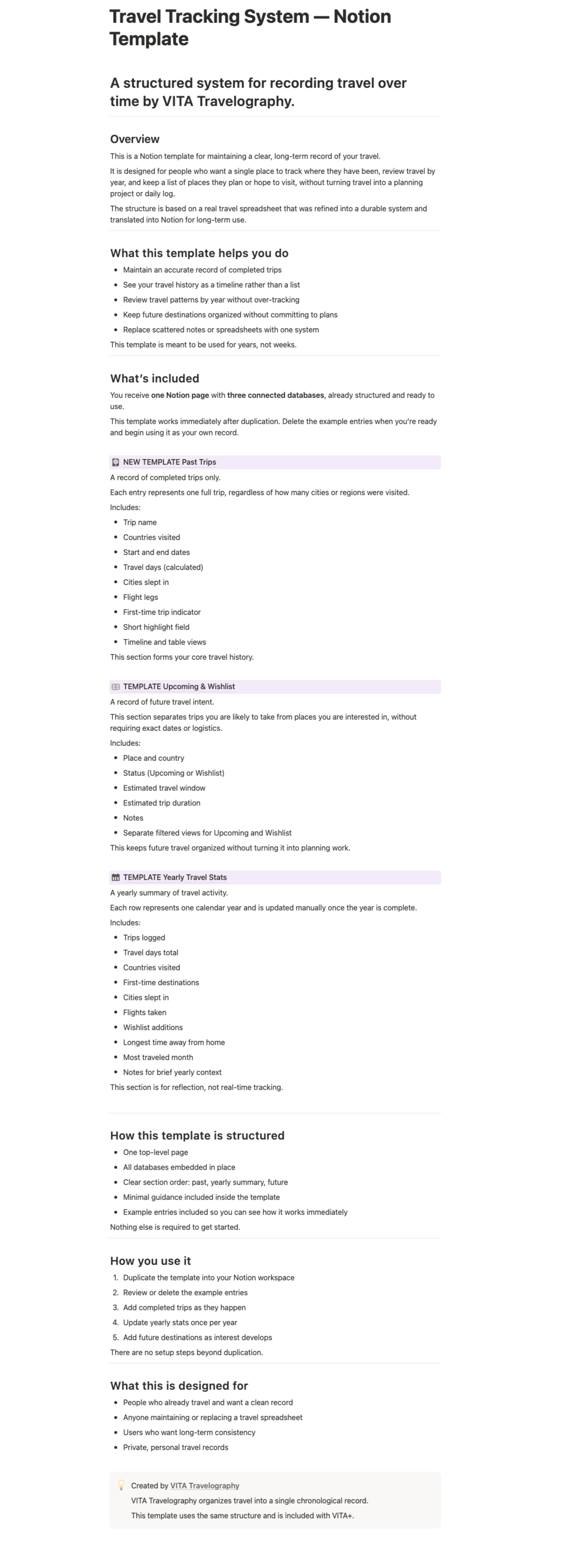 A structured, long-term system for recording your travel over time. Track past trips, future destinations, and yearly travel stats in one private workspace. Built in Notion. No prior experience required.